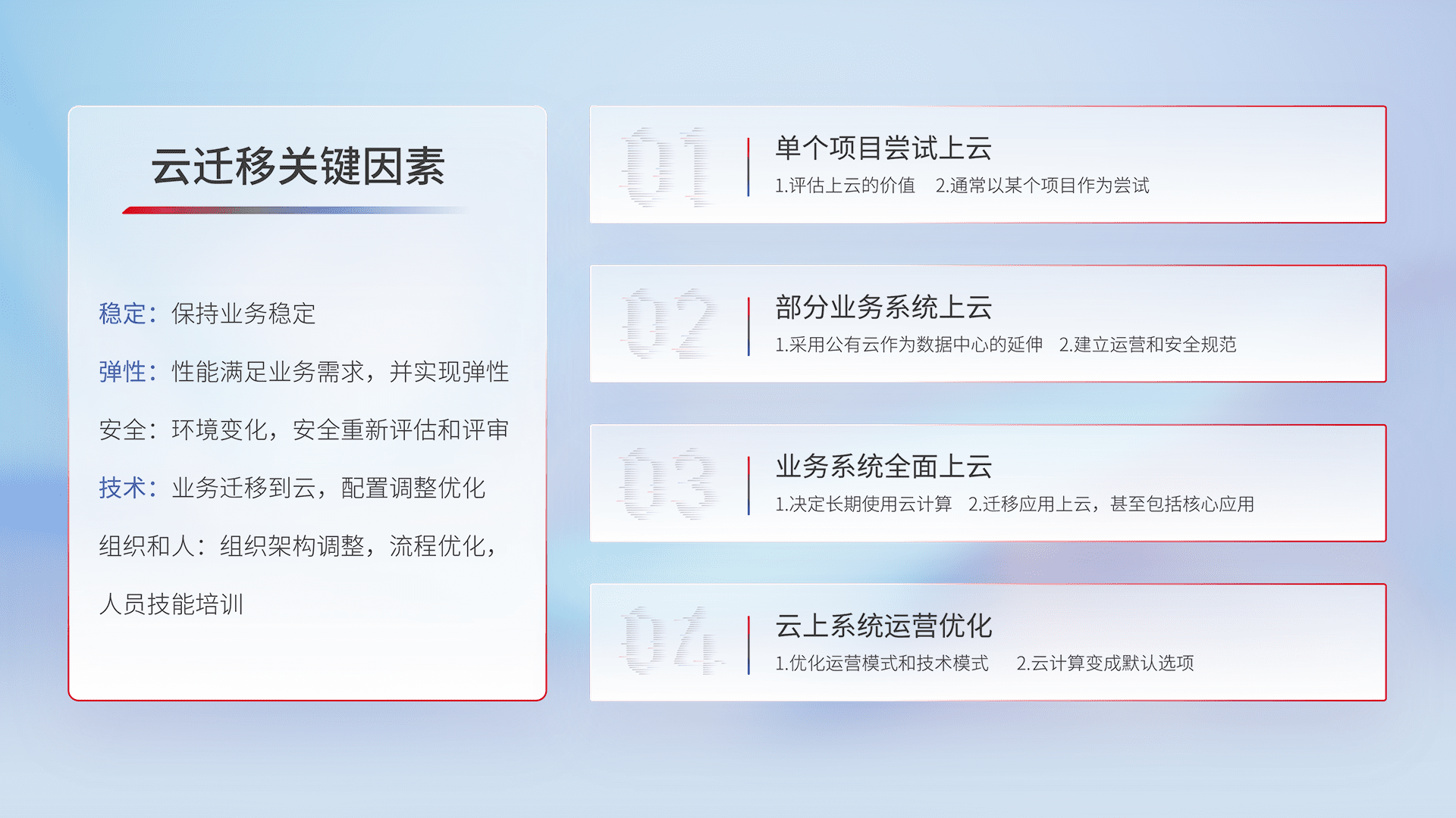结合实际业务,,,从规划设计、、、云平台选型、、、云原生改造、、数据迁移、、、、集成交付,,,迁移全过程为客户识别最佳上云路径,,做好风险识别管理,,,设计网络架构、、、身份权限、、安全审计合规、、、、操作审计、、日志审计、、、、监控告警策略、、多站点容灾设计等,,,对云上基础设施进行整体规划,,提升IT治理水平,,,,以满足弹性、、、高可用、、、、高性能的需求。。。。