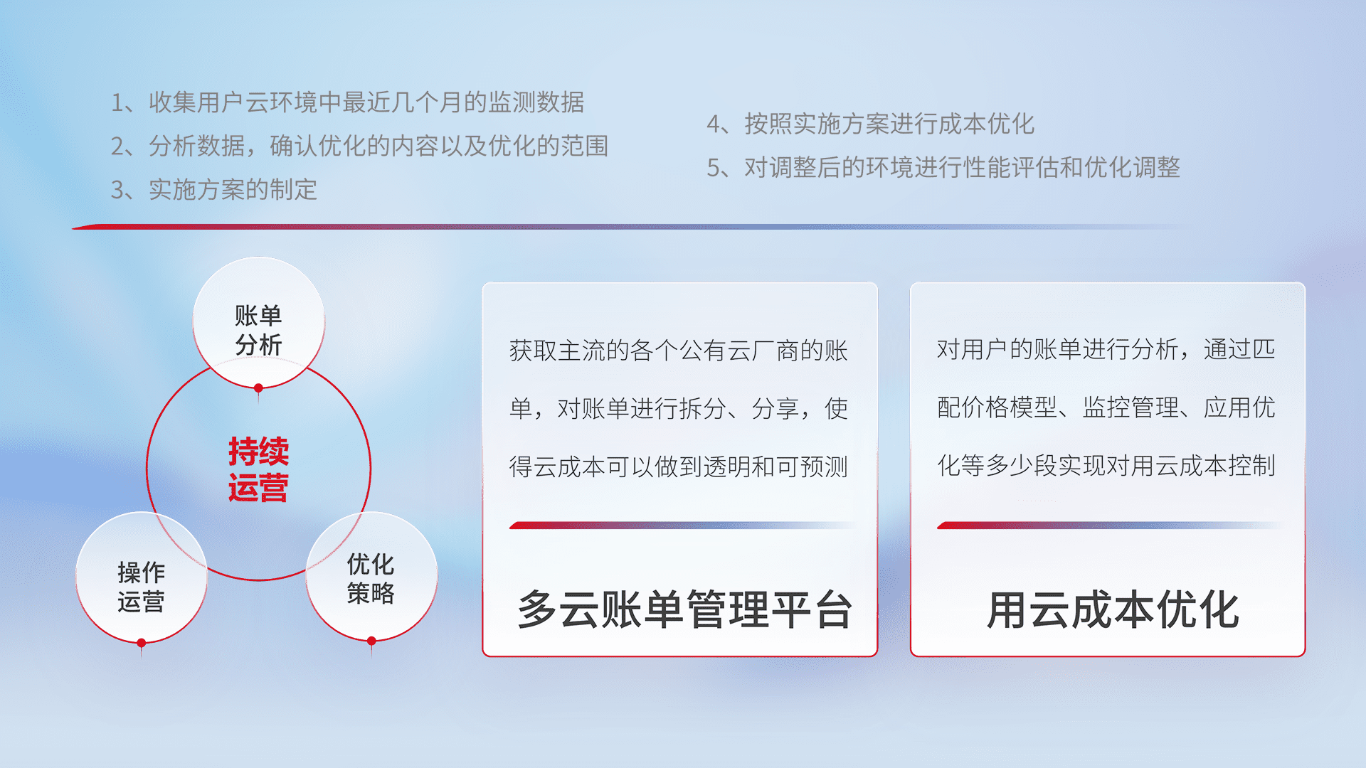 通过多云纳管,,,以统一的资源数据模型把客户的云资源进行抽象和封装,,,进而实现对多云资源的统一操作,,,保障云资源管理的可靠性、、、、稳定性与可用性。。量身定制化运维内容,,,,配置、、、开发运维、、、补丁管理、、、、备份、、、、监控、、、认证和访问管理、、、、审计和日常巡检等,,保障在用云过程中的可靠度,,稳定度以及高可用率。。